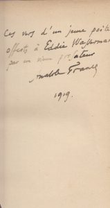 Édition originale. Elle a été tirée à 500 exemplaires sur vélin, sans grand papier. Envoi autographe signé d'Anatole France à Edward Wassermann, daté de 1919 : Ces vers d'un jeune poète, offerts à Eddie Wassermann, par un vieux prosateur... Banquier américain héritier des financiers Seligman, Edward Wassermann (qui changerait son nom en Waterman) fréquenta les milieux artistiques et littéraires européens, et se constitua une collection d'art moderne. Il a laissé des souvenirs intitulés Anatole France vu par un Américain, parus en 1930 à la suite de ceux de Jacques de Lacretelle. De petits frottements aux charnières.