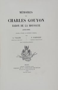 *** VALLEE (G.), PARFOUROU (P.) [Ed.]. Mémoires de Charles Gouyon, baron de la Moussaye (1553-1587). Paris, Perrin, 1901, 2 vol. grand in-8, XXIV-248 + 24 p. (Supplément), 32 planches dont une carte dépliante, broché (rousseurs sur une couv.,...