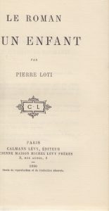 LOTI (Pierre). Le Roman d'un enfant. Paris, Calmann Lévy, 1890. In-12, maroquin bleu-gris, doublures de maroquin bleu de Prusse encadrées d'un filet doré, gardes de soie brochée fleurie, doubles gardes, couverture, tranches dorées sur témoins...