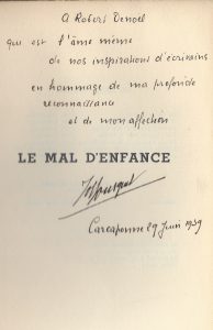 Édition originale. Un des 15 exemplaires sur vergé blanc de Hollande, deuxième papier après 7 japons. Bel envoi autographe signé de l'auteur à son éditeur Robert Denoël daté Carcassonne 29 juin 1939 : à Robert Denoël, qui est l'âme même de nos inspirations d'écrivains, en hommage de ma profonde reconnaissance et de mon affection.