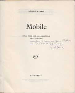 BUTOR (Michel). Mobile. Étude pour une représentation des États-Unis. Paris, Gallimard, 1962. In-8, broché, partiellement non coupé.