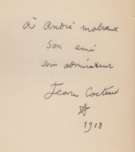Édition originale, ornée d'un portrait-frontispice sur chine d'après Jean Hugo. Exemplaire numéroté sur vergé Navarre. Envoi autographe signé à André Malraux de son ami, son admirateur, Jean Cocteau, daté 1928. Dos insolé et déchiré.