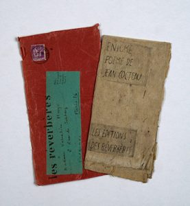 Édition originale de cette rare publication, poème entièrement gravé sur cuivre en lettres capitales, orné d’un frontispice de Jean Cocteau également gravé. Tirage à 137 exemplaires sur papier extra-fin du Japon. Exemplaire de Valentine Hugo, avec l'enveloppe d'envoi à ses nom et adresse rédigés par H. Bernard, le directeur des Réverbères, avec timbre et cachet postal.