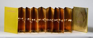 Suite de 24 feuillets de papier doré perforés irrégulièrement et repliés en accordéon par le sculpteur Lucio Fontana. Ils illustrent ce que l’artiste nommait ses « concepts spatiaux » déjà définis par lui en 1947 dans le manifeste du « Spatialisme ». Production à 200 exemplaires. Exemplaire justifié et signé à la pointe d’acier par Lucio Fontana.