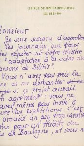 « Édition recherchée, surtout en grand papier » (Carteret), illustrée de 25 compositions en couleurs de Paul-Émile Bécat. Un des 30 exemplaires de tête sur Japon, avec une aquarelle originale signée de Paul-Émile Bécat, une suite en couleurs et une suite en noir. Exemplaire enrichi d'une lettre autographe signée de Pierre Louÿs interdisant de faire jouer ses Chansons de Bilitis au directeur du théâtre de verdure du Pré-Catelan et de la lettre autographe envoyée en réponse par celui-ci. Carteret, IV, 252 – Monod, n°7391.