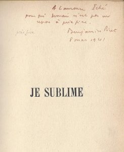 PÉRET (Benjamin). Je sublime. Paris, Éditions surréalistes, 30 juin 1936. Plaquette in-16, brochée, couverture vert d’eau imprimée rempliée.