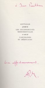 Premières éditions collectives. Exemplaires numérotés sur vélin bouffant, tels que parus. Envoi autographe paraphé de l'auteur à Jean Paulhan dans chaque ouvrage. On joint, du même : Cartolines et dédicaces. (1953-1960). Paris, Le Terrain Vague, 1960. In-16, broché. Édition originale. Un des exemplaires de tête sur Madagascar crème, celui-ci hors commerce (justifié à la main : H.C. VI/XL), les seuls accompagnés d'une aquatinte originale signée de Bona, ici en deux états signés. Envoi autographe signé de l'artiste à la justification du tirage. Un second exemplaire de l'ouvrage est joint, sur papier ordinaire.
