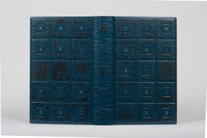 PINGET (Robert). L'Inquisitoire. Paris, Minuit, 1962. In-8, maroquin bleu à gros grain, plats ornés de quinze carrés en relief du même maroquin rehaussé de doré contenant le titre et le nom de l'auteur en lettres dorées, dos lisse muet orné...
