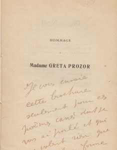 Édition originale de cette plaquette tirée à petit nombre en hommage à l'actrice Greta Prozor, qui lut les poèmes de Reverdy le 18 janvier 1917 à "Lyre et Palette". Envoi autographe de Pierre Reverdy : Je vous envoie cette brochure seulement pour ces poèmes carrés dont je vous ai parlé et qui ne valent rien que par leur forme. Le destinataire de cette dédicace non signée est demeuré inconnu. C'est précisément cette préséance de la forme plastique qui valut au poète son rattachement au mouvement cubiste. Selon Max Jacob, « Mlle Greta Prozor a compris ce qu'il y a de peu verbal dans la poésie moderne et particulièrement dans celle de M. Reverdy ».