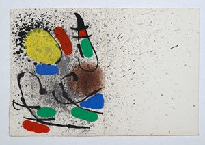 Édition originale dédiée à l’imprimeur-éditeur-poète Guy Lévis Mano. Un des 103 exemplaires numérotés sur papier vélin d’Arches, les seuls contenant en frontispice, une lithographie originale en couleurs et à double page signée par Joan Miró.