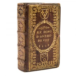 encadrement sur les plats, médaillon au centre avec inscription Ex dono d’Antho. Druot 1648, blasons en haut et en bas, dos à nerfs orné, tranches dorées, restes de lacets.