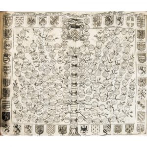 Édition originale ornée d’un grand arbre généalogique replié avec blasons gravés, de nombreuses vignettes héraldiques en taille-douce dans le texte, certaines coloriées, et d’une grande et belle vignette sur le titre.