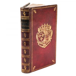  Fraîche reliure en maroquin aux armes d’Auguste de Bade, duchesse d’Orléans, morte en couches à 21 ans en 1726. Le livre – imprimé en 1787 – ne peut donc pas lui avoir appartenu et la présence des armes, très bien frappées, est difficile à expliquer.
