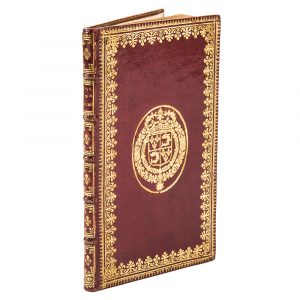centre, dos à nerfs fleurdelisé, doublures de maroquin rouge bordées d’une dentelle dorée, tranches dorées.