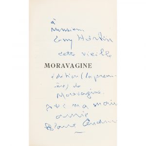  Un des 110 exemplaires sur vélin pur fil Lafuma, celui-ci enrichi d’un envoi autographe de Cendrars à Guy Hörlin, ainsi que d’une lettre dactylographiée de ce dernier demandant à l’auteur la faveur d’un autographe. Dos et charnières frottés.