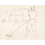 Au verso, Cocteau a représenté à pleine page un personnage de dos, tenant en laisse un chien devant un château, avec la mention : "Vive la France."