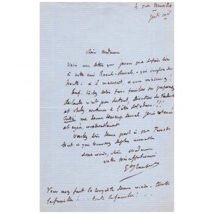 Gustave FLAUBERT. 1821-1880. Écrivain. L.A.S. à Mme Perrot. Jeudi soir. 1 pp. in-8, papier bleu. ►Belle lettre d’un Flaubert attaché à perpétuer et achever l’œuvre de son ami Louis Bouilhet, Mademoiselle Aïssé. Voici une lettre que...