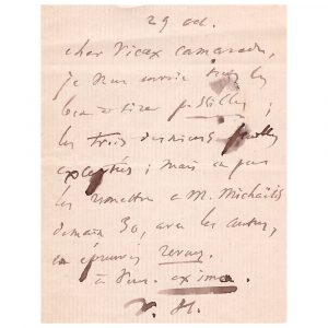 Victor HUGO. 1802-1885. Écrivain poète. L.A.S. (à Auguste Vaquerie). S.l., 29 octobre (1862). 1 pp. in-16. Lettre hâtive relative aux bons à tirer pour Les Misérables ; Cher vieux camarade, Je vous envoie les bons à tirer...