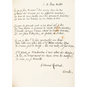 Le véritable esprit est celui qui donne des ailes à l’enthousiasme. L’éclat de rire est une gamme montante. Ce qui est léger, c’est l’âme. Et voilà pourquoi il faut un théâtre où, exaltant avec du lyrisme, moralisant avec de la beauté, consolant avec de la grâce, les poètes, sans le faire exprès, donnent des leçons d’âme ! Voilà pourquoi il faut un théâtre poétique, et même héroïque ! Sur le premier feuillet, Rostand a ajouté une note d’envoi de ce manuscrit un peu sali par les doigts de typos ; je vous l’offre de tout cœur puisque ces choses vous intéressent : il est tout entier de la main de ma femme [la poétesse Rosemonde Gérard].
