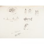 • 6 croquis, à l’encre noire, sur un feuillet signé et daté "Pluie. Cambo. 1902 !". Rostand a représenté sous une "pluie" de fines hachures, sa maison, le jardin, un cocher, des fermiers et des cheveux et lui-même, vêtu d’une pelisse et tenant un grand parapluie ouvert.-
