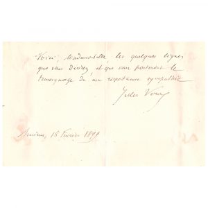 Jules VERNE. 1828-1905. Écrivain. P.A.S. Amiens, 18 février 1899. 1 page oblong in-8, trace d’ancien collage au verso. ▬joint •un portrait photo. de Jules Verne (retirage). Dédicace du fameux écrivain, tirée d’une page...