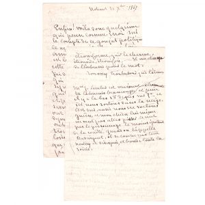 Enfin ! voilà donc quelqu'un qui pense comme moi sur le compte de ce goujat politique. Ce ne pouvait être que toi, ami de mon cœur. Etroniformés est le mot sublime qui classe cette espèce de végétaux merdoïdes. J’ai des camarades et de bons garçons qui se prosternent devant tout symptôme d'opposition quelqu'il soit et d'où qu'il vienne et pour qui ce saltimbanque sans idées est un Dieu. Ils ont pourtant la queue basse depuis ce discours à grand orchestre. Ils commencent à trouver que c'est aller un peu loin, et peut être est-ce un bien que, pour conquérir la royauté parlementaire, le drôle ait vidé son sac de chiffonnier, ses chats morts et ses trognons de chou devant tout le monde. Cela instruira quelques uns. Oui, tu feras bien de disséquer cette âme en baudruche et ce talent en toile d’araignée ! Malheureusement quand ton livre arrivera, il sera peut être élagué et point dangereux, car de tels hommes ne laissent rien après eux : mais peut-être aussi sera-t-il au pouvoir. On peut s'attendre à tout (…).