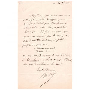 My Dear, par un inconcevable oubli, j’ai omis de te rappeler que nous étions invités par Destailleurs à nous rendre chez lui, ce jourd’hui lundi, 30. Il fait si crotté que je ne me sentirai pas le courage ce soir d’aller te prendre, et préfère grimper en omnibus. Fais comme moi, Console toi et sois chez Destailleurs de ton côté vers les huit heures. En tout cas, à demain chez moi, de bonne heure ! (…).