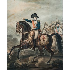 DÉBUT DU XIXe siècle. Napoléon à cheval avec ses généraux. Lithographie en couleurs encadrée. Quelques rousseurs. 760 x 600 mm (à vue).