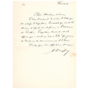 Dreyfus transmet la lettre du Capitaine Converset désireux d’assister avec sa femme, à la cérémonie du Panthéon ; il ajoute à sa faveur que cet officier a composé une "ode à Zola" que je vous ai transmise au commencement de l’hivers (…).