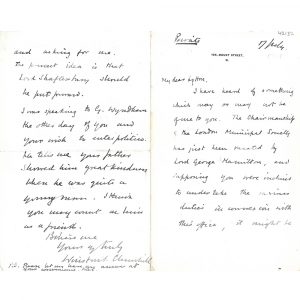 Son ami Goulding connait tous les details et lui serait un allié très puissant ; il suggère qu’il vienne le voir à la Chambre des Communes vendredi après-midi pour en discuter indiquant que le candidat actuel est Shaftesbury. Churchill a parlé de lui à Wyndham de son désir de faire de la politique ; He tells me your father showed him great kindness when he was quite a young man. I think you may count on him as a friend (…).