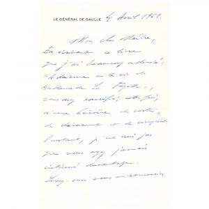 Charles DE GAULLE. 1890-1970. Militaire et homme d’Etat. L.A.S. adressée à André MAUROIS. 4 avril 1961. 1 page 1/2 in-8 à son en-tête, enveloppe. ►De Gaulle fait part auprès de l’écrivain de son admiration pour Adrienne ou la vie...