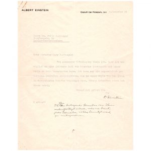 Albert EINSTEIN. 1879-1955. Physicien théoricien. L.S. avec post-scriptum autographe et P.S., à Fritz Bamberger. Caputh bei Potsdam, 6 novembre 1932. 2 ff. in-4 dactylographiées ; en allemand. A propos de la recherche de fonds pour...