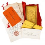 Je suis une étoile qui ne brille que par la grâce du Ciel, je suis une herbe qui ne fleurit que par la grâce du Printemps. Ma joie n’a pas de borne (…). (sur papier de riz rouge, doublée de soie jaune, enveloppe rigide de soie jaune et orange ; joint une transcription en français).