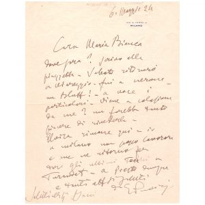 Giacomo PUCCINI. 1858-1924. Compositeur italien. L.A.S. à Maria-Bianca (Ginori). Milan, 6 mai 1924. 1 pp. in-4, en-tête à son adresse à Milan, joint son enveloppe timbrée ; en italien. Correspondance six mois avant sa mort, évoquant son...