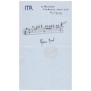 Maurice RAVEL. 1875-1937. Compositeur.P.A.S. avec musique. Montfort l’Amaury, 14 décembre 1932. Demi-page in-8 sur carte lettre au chiffre de Ravel et à en-tête du Belvédère, adresse au verso avec timbres et marques postales. Bel envoi...