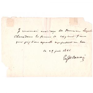 Eugène DELACROIX. 1798-1863. Artiste peintre. P.A.S. Ce 25 juin 1846. 1 pp. 1/2 in-8 oblong, petit manque en coin, trou de poinçon. Quittance où Delacroix reconnait avoir reçu de M. Léopold Chevadame, (…) la somme de cinq cent francs pour...