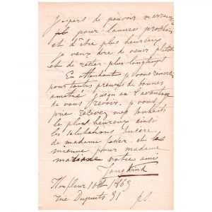 Johan-Barthold JONGKIND. 1819-1891. Artiste peintre néerlandais, précurseur de l’impressionnisme. L.A.S. à son ami Eugène Boudin. Honfleur, 10 octobre 1863. 4 pp. bi-feuillet in-8. ►Lettre écrite lors d’un des premiers séjours de...
