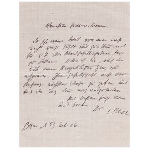 Paul KLEE. 1879-1940. Artiste peintre. L.A.S. à Marie von Sinner. Berne, 23 juillet 1906. 1 pp. in-12 ; joint son enveloppe ; en allemand. ►Lettre de jeunesse, à propos d’une réception donnée par Mme Sinner ; il lui semble...