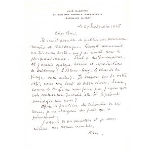 René MAGRITTE. 1898-1967. Artiste peintre surréaliste. L.A.S. Bruxelles, 29 septembre 1965. 1 pp. in-8, en-tête à son adresse. A propos de la publication d’un article dont il se chargera des frais ; Il serait possible de publier un...