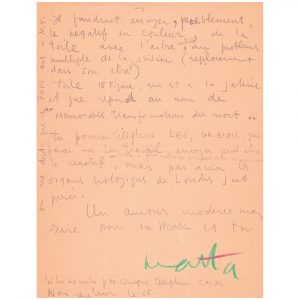Roberto Matta Echaurren dit MATTA. 1911-2002. Peintre surréaliste chilien.L.A.S. (à Julien) avec croquis. S.l.n.d. 2 ff., au crayon, croquis crayon et crayon vert, "Julien" surligné au crayon rouge, signature au crayon vert et rouge. Après...