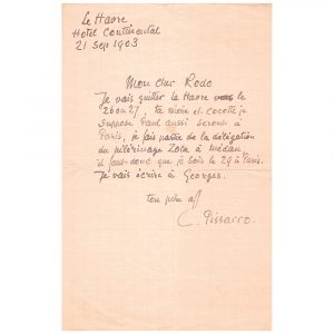 Camille PISSARRO. 1830-1903. Artiste peintre. L.A.S. à son cher Rodo. Le Havre, 21 septembre 1903. 1 pp. in-8 sur papier quadrillé, annotations au crayon au verso ; fentes au pli. Pissaro annonce qu’il part pour Paris ; Je vais quitter...