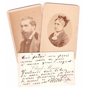 •deux très rares photographies en tirage de l’époque représentant Claude Monet et Camille Léonie Doncieux (1847-1879), modèle favori du peintre dès 1865 et qui deviendra son épouse. [sur papier albuminé, contrecollées sur un carton au nom du photographe Albert Greiner à Amsterdam (5,5 x 8,5 cm)].