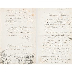 Auguste RODIN. 1840-1917. Sculpteur. L.A.S. illustrée de deux dessins, à Madame Dewavrin. (Paris), 22 février 1886. 3 pp. in-8. ►Belle lettre de remerciements à l’épouse du maire de Calais, alors que Rodin travaille au groupe des...