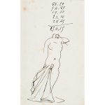 Au verso du feuillet, un autre dessin, toujours à l’encre noire, représente une silhouette d’homme nu, sans tête [esquisse d’un des bourgeois, peut-être Jacques de Wissant avec son bras levé ?], avec dans la marge supérieure une addition pour la somme totale de 254, 15.