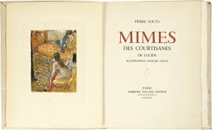 LOUŸS (Pierre). Mimes des courtisanes de Lucien. Illustrations d’Edgar DEGAS. Paris, Ambroise Vollard Éditeur, 1935 ; In-4 en ff. sous couv. 22 belles gravures érotiques d’Edgar Degas gravées par Maurice Potin dont 4 hors texte parmi...