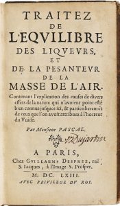 PASCAL. Traitez de l’équilibre des liqueurs et de la pesanteur de la masse de l’air. Paris, Desprez, 1663 ; In-12 veau brun, dos à nerfs orné et dor. (Reliure de l’époque usagée). ÉDITION ORIGINALE. 4 figures gravées en...