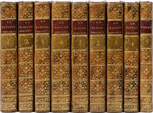 Ensemble 9 vol. in-12 veau jaspé, pièces de titre et tomaison sur les dos ornés et dor., cadre de fil. dor. sur les plats, tr. marbr. (Reliures de l’époque).