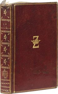 VOLTAIRE. La Pucelle d’Orléans. Sl (Genève), sn, 1762 ; In-8 maroquin rouge, titre dor. sur le dos orné de pièces de blasons dor. et répétés , triple cadre de fil. dor. avec monogramme couronné dor. au centre des plats, tr. dor. (Reliure...