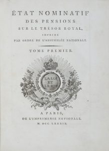 *** État nominatif des pentions sur le trésor royal, imprimé par ordre de l'Assemblée nationale. Paris, Impr. nationale, 1789-1791, 4 vol. in-4, reliure époque plein veau fauve marbré, dos à 5 nerfs, fleurons et filets dorés, pièce de titre...