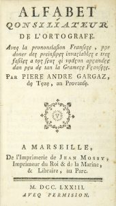 GARGAS (Pierre-André). - Alphabet Qonsiliateur de l'Ortografe. Aveq la prononsiasion Franseze, por doner dez preinsipez invariablez e trez fasilez a toz seuz qi vodron apprendre dan peu de tan la Gramere Franseze. Marseille, De l'Imprimerie de...